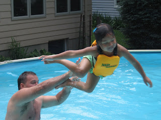 Last week Poppy decided to teach Reese how to swim. We didn't know how she would do with the chaos of a real swim class with the noise. So her lesson started with a dive with no life vest and off she went. No more life vest for her!! The girl has no fear!!!